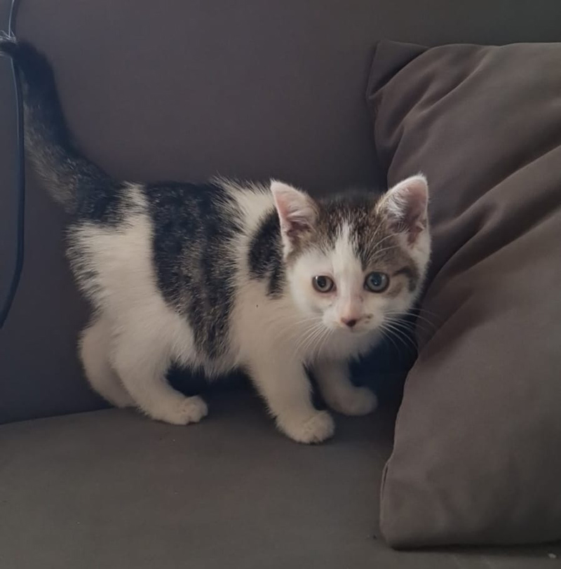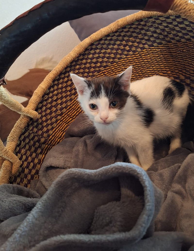 Mädel 1: ca 8 Wochen sehr neugierig und verschmust, weiß mit schwarzen punkten